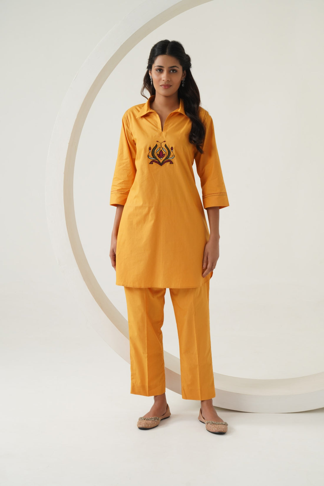 Embrace effortless elegance with this chic mustard co-ord set crafted from breathable cotton fabric. The...
