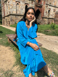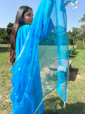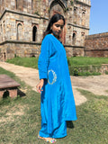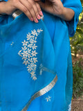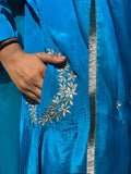 Step into regal elegance with this crepe silk Mughlai Choga kurta, paired with wide-leg pants. The ensemble is completed with an organza silk dupatta featuring exquisite hand and machine embroidery, for a truly luxurious finish.