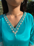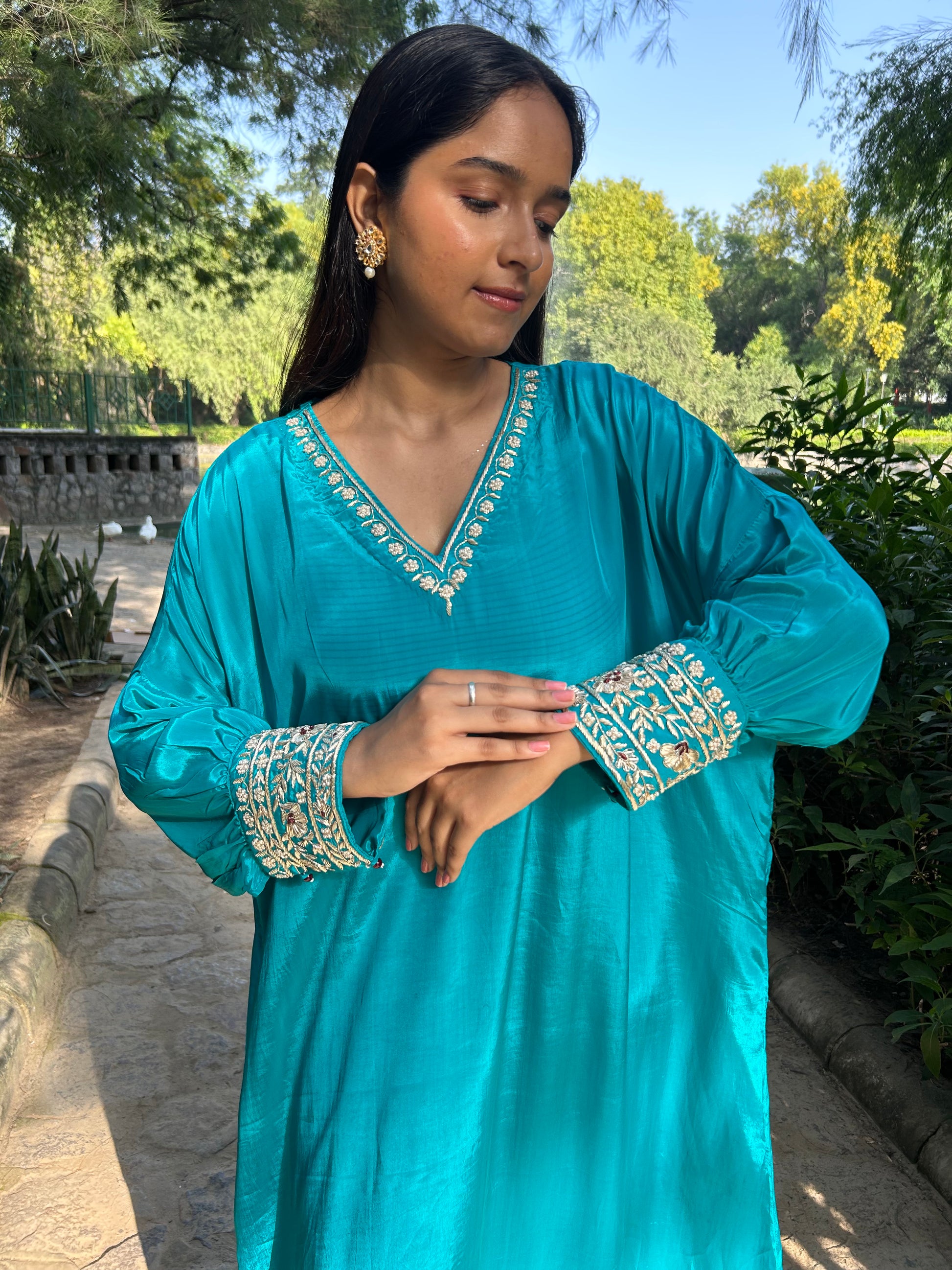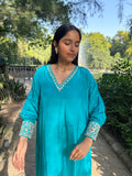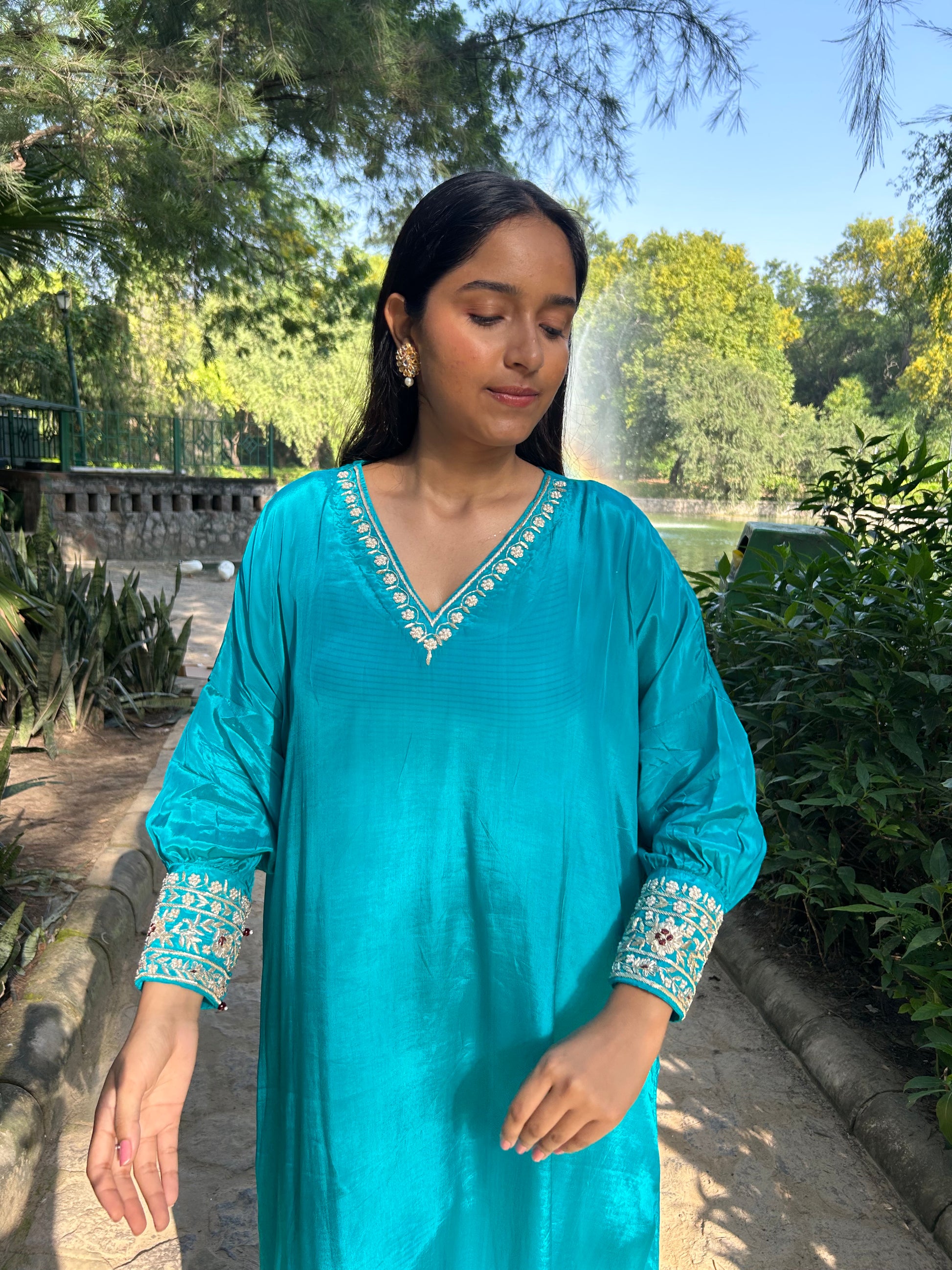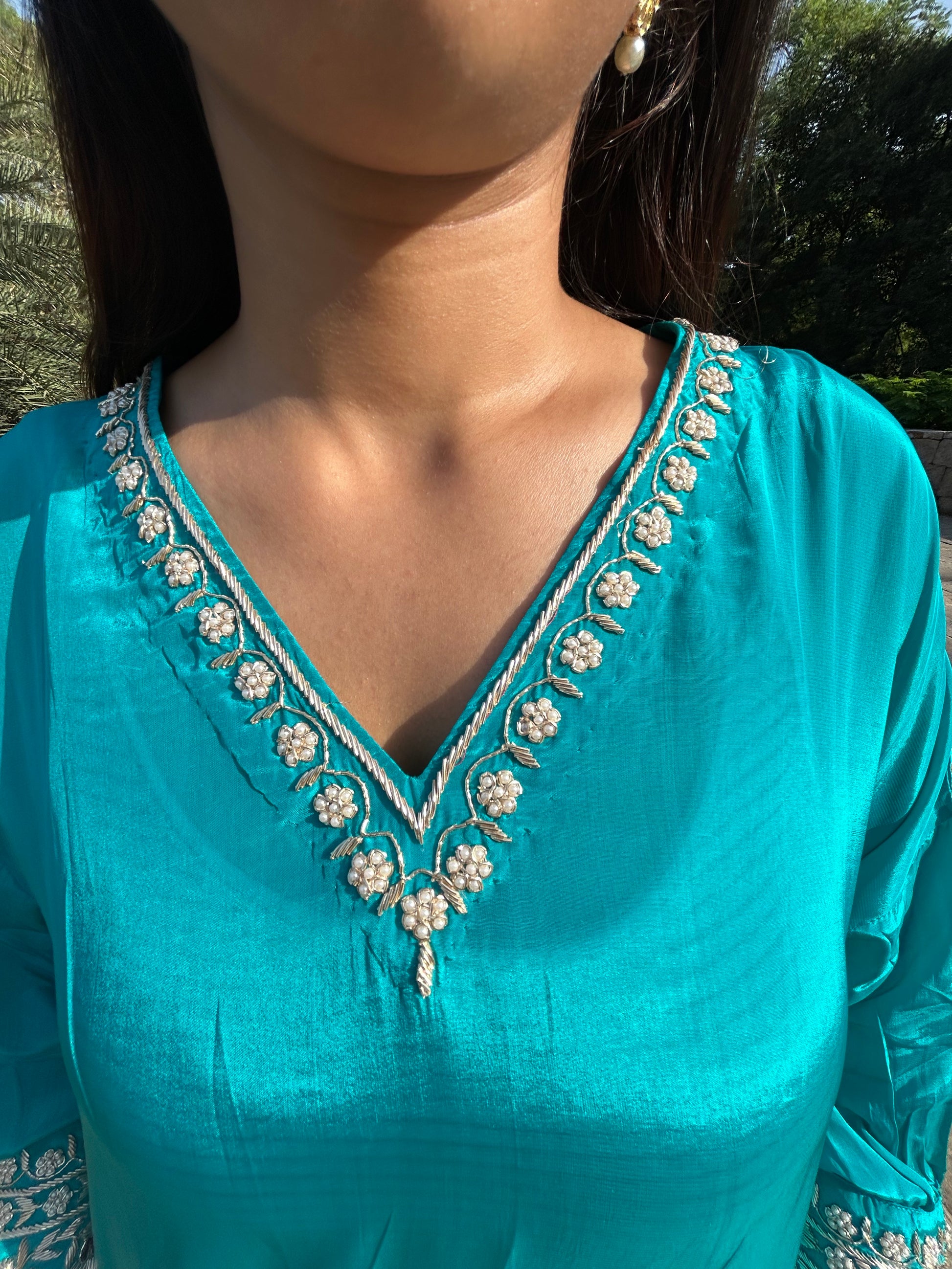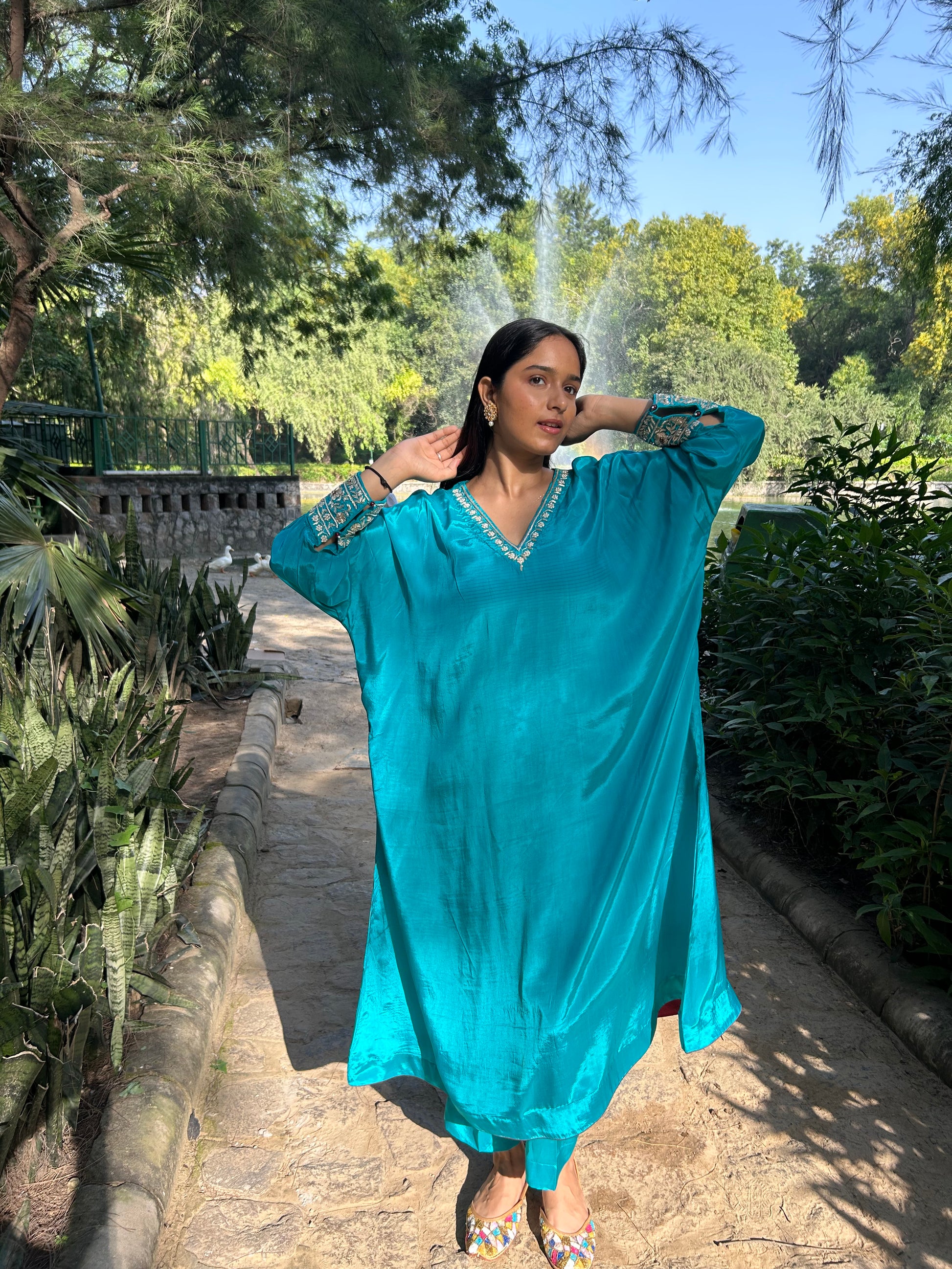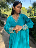 Elegance redefined—this crepe silk Choga cut co-ord set features intricate zardosi embroidery on the neckline and sleeves, blending traditional craftsmanship with modern styling.