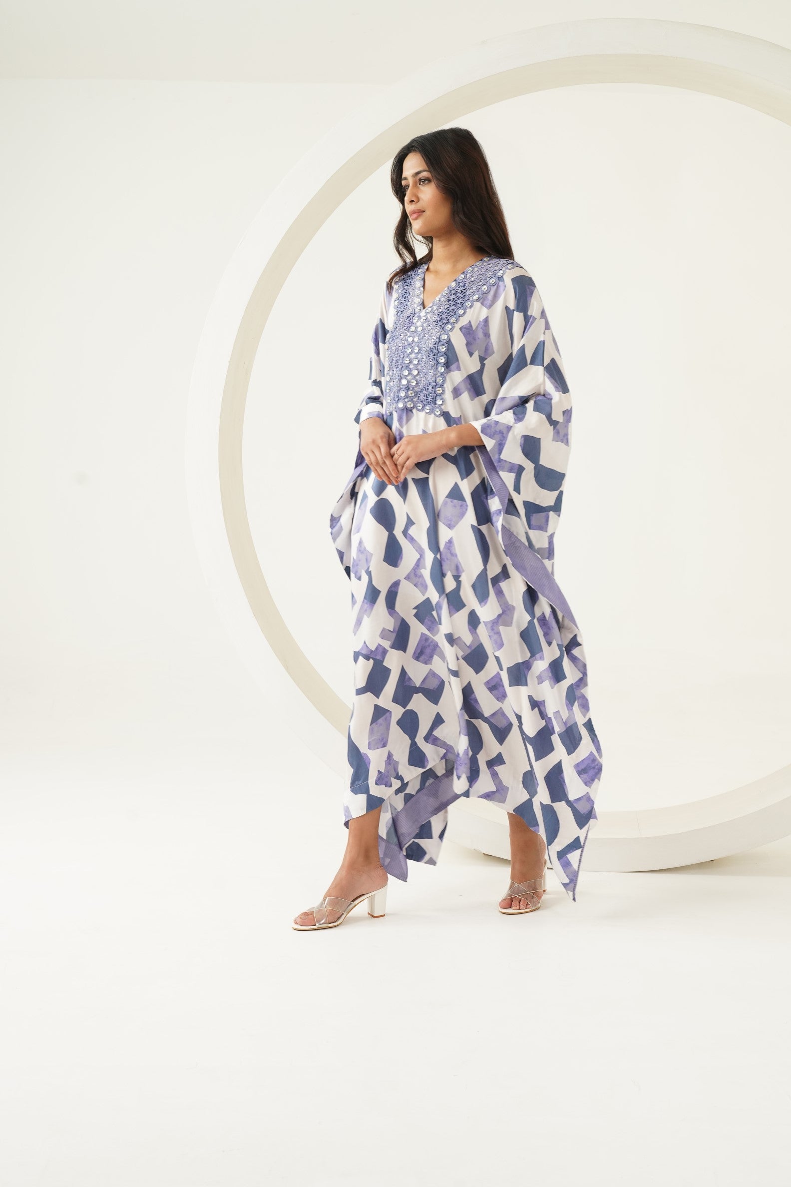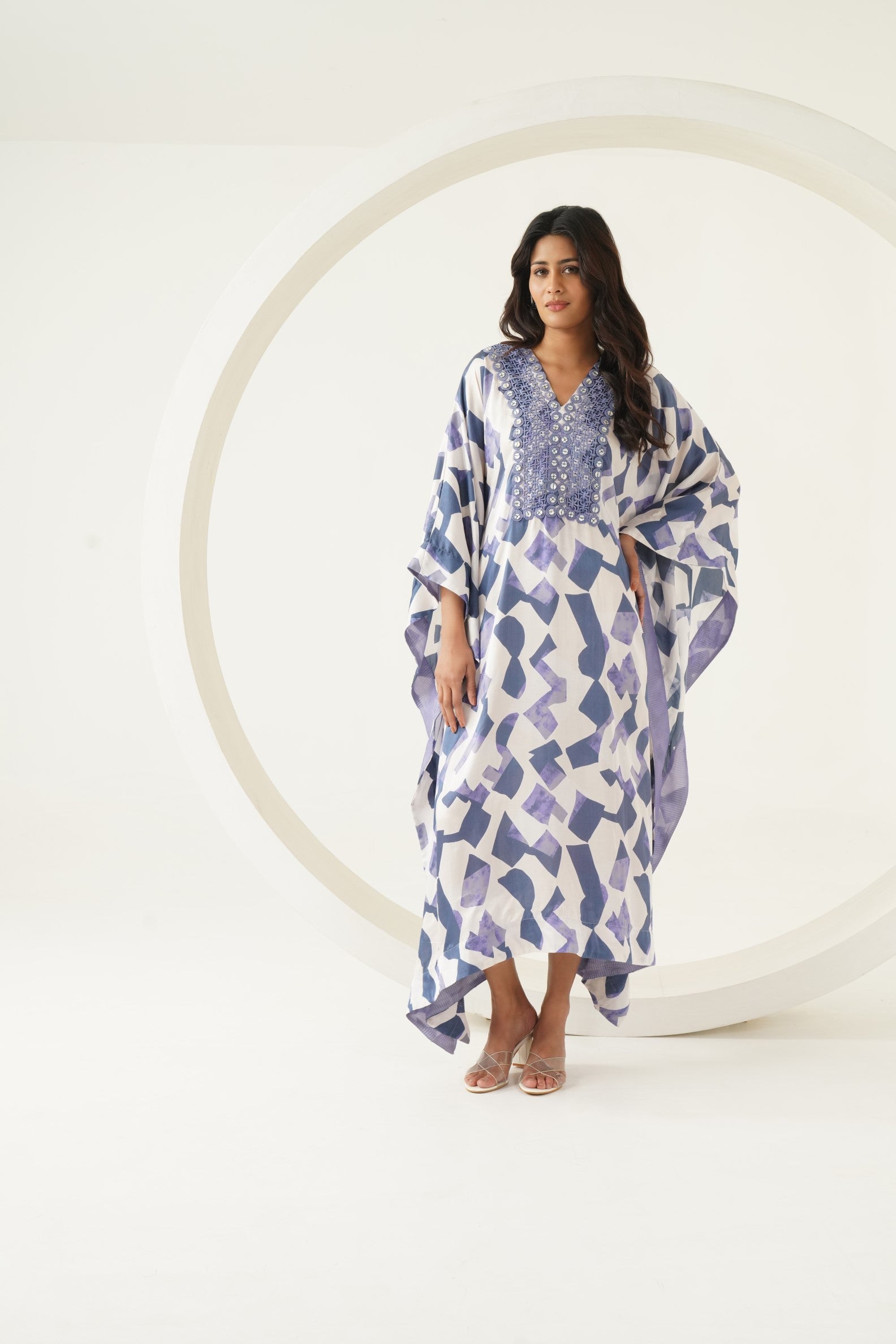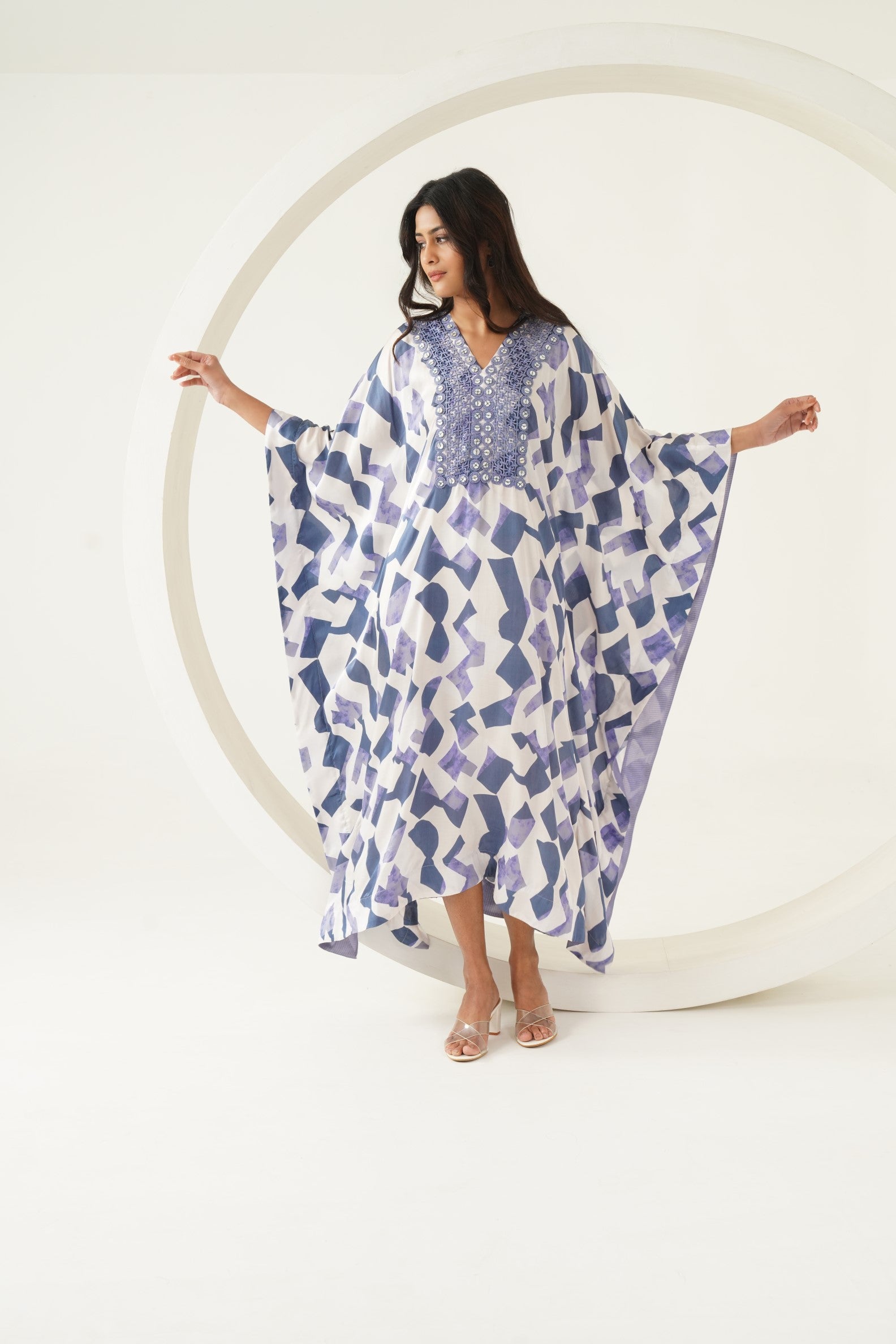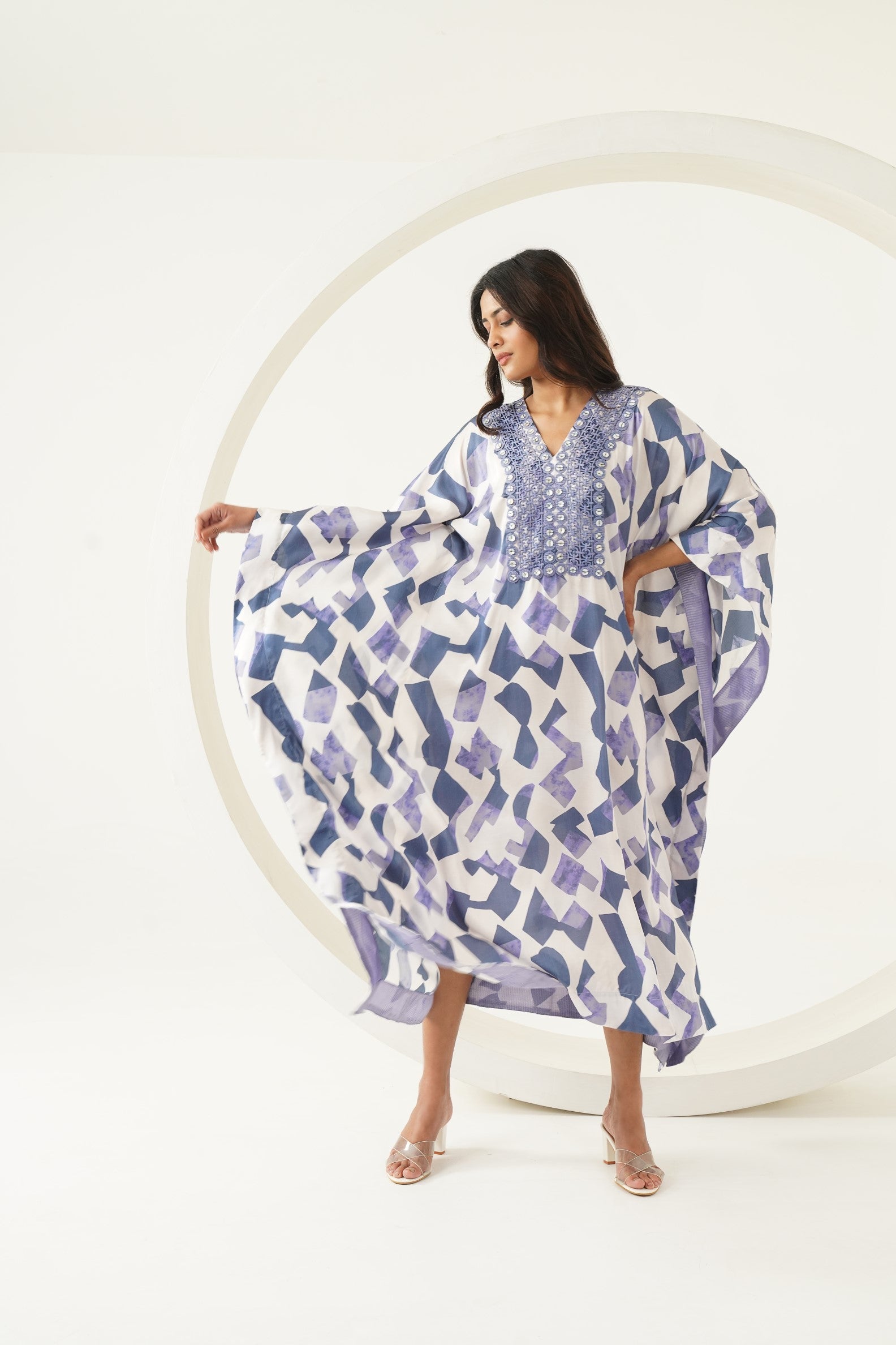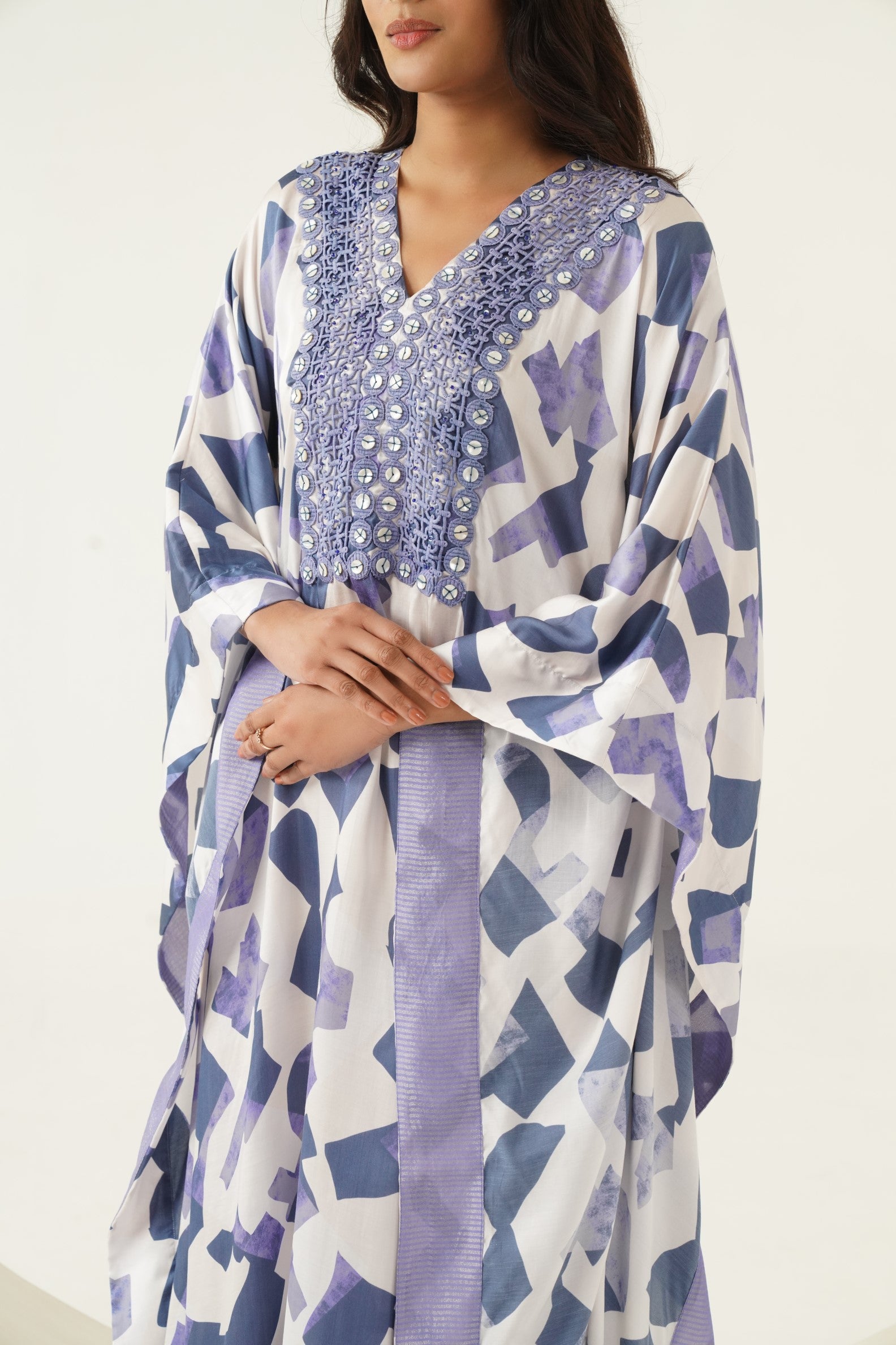 Indulge in the elegance of this full-length, flowy modal satin kaftan, designed for ultimate comfort and sophistication. The kaftan features intricate work on the neck, adding an artisanal touch, while the mauve stripe border elevates its chic appeal. Perfect for a casual day out or a relaxed evening event, this kaftan is a timeless addition to your wardrobe.