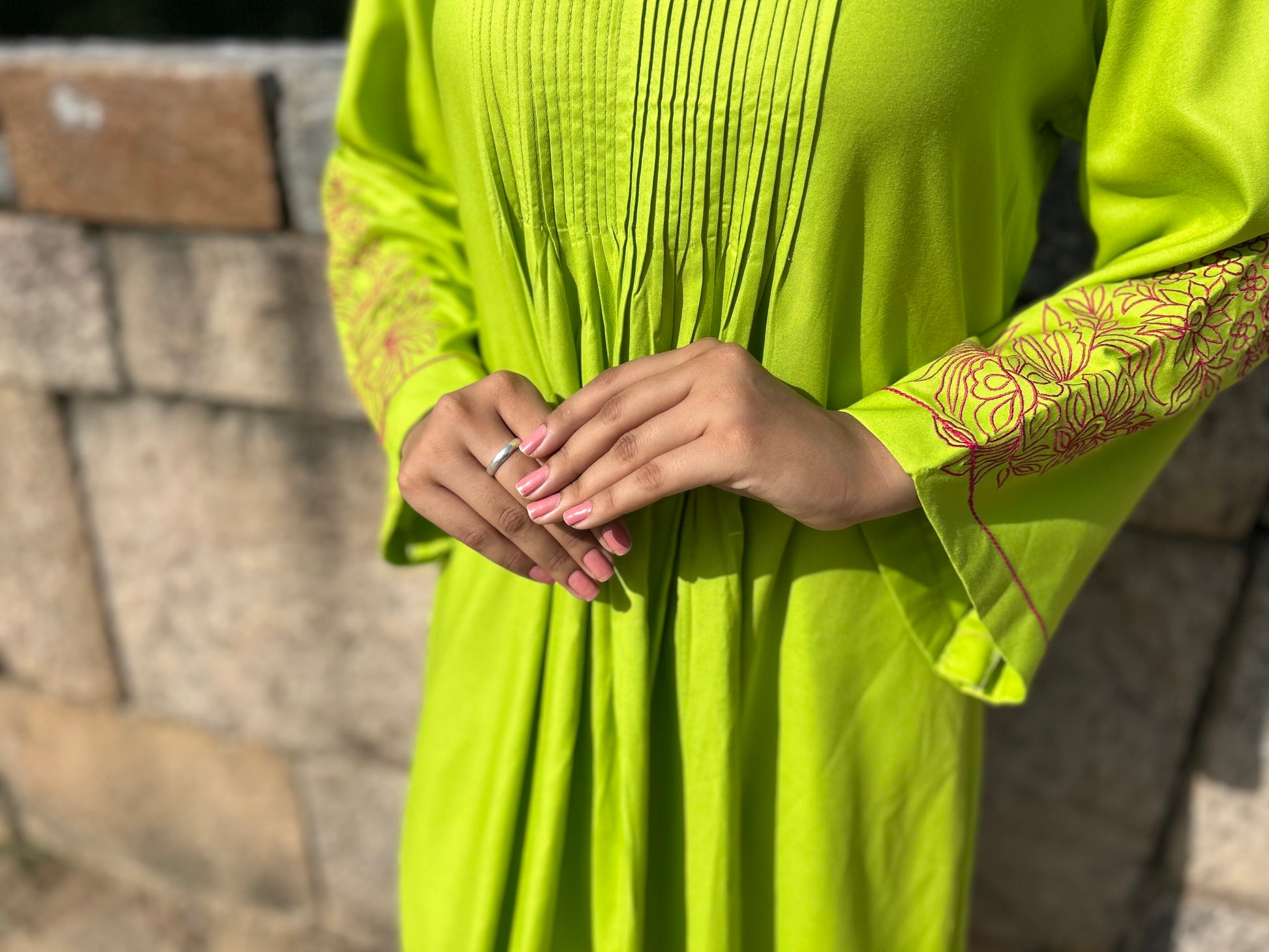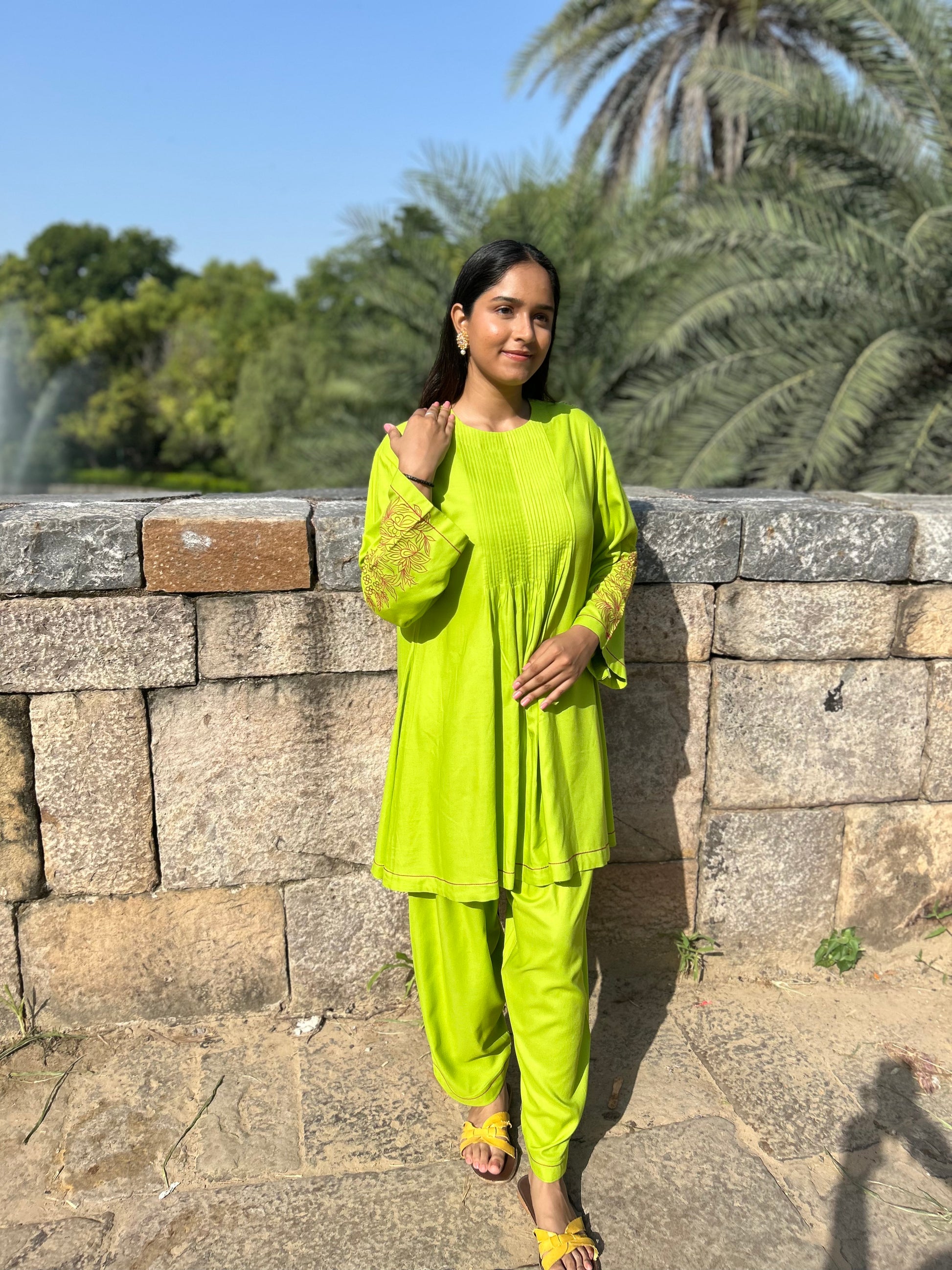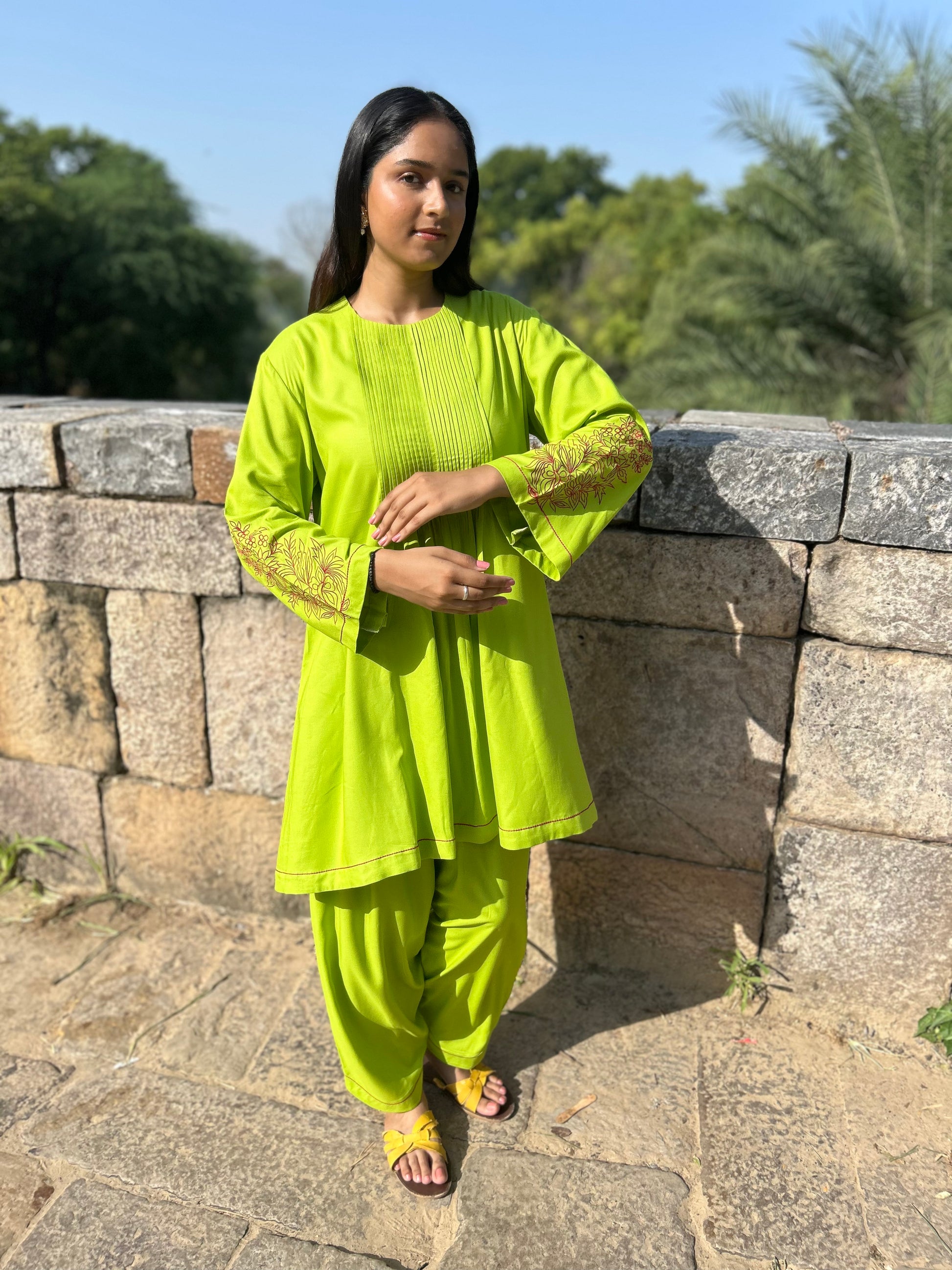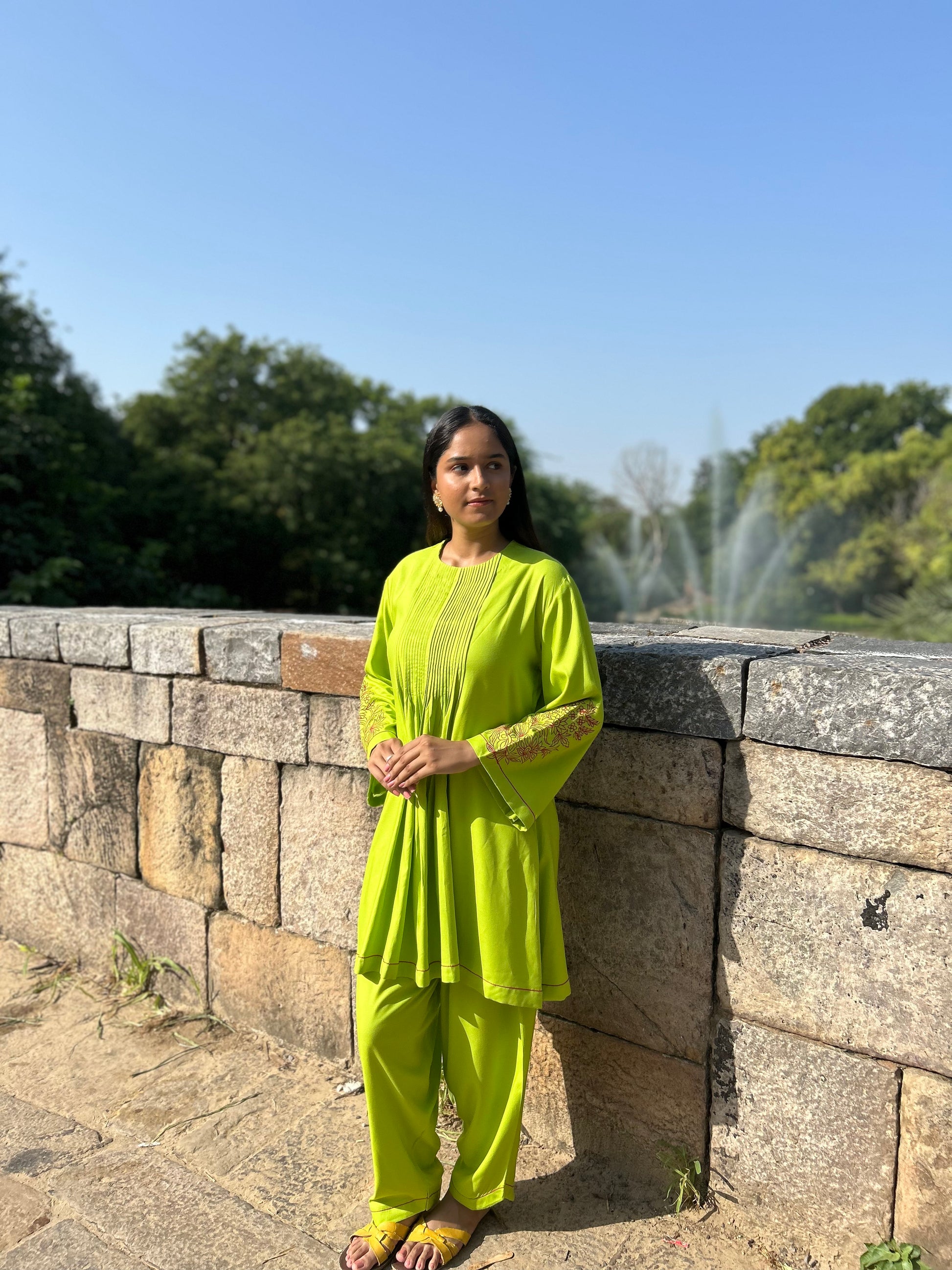 Refined and comfortable—this cotton co-ord set features a closed slit kurta with pintuck detailing on the neck, bell sleeves, and contrast embroidery, paired with a matching salwar for a sophisticated ethnic look.
