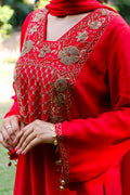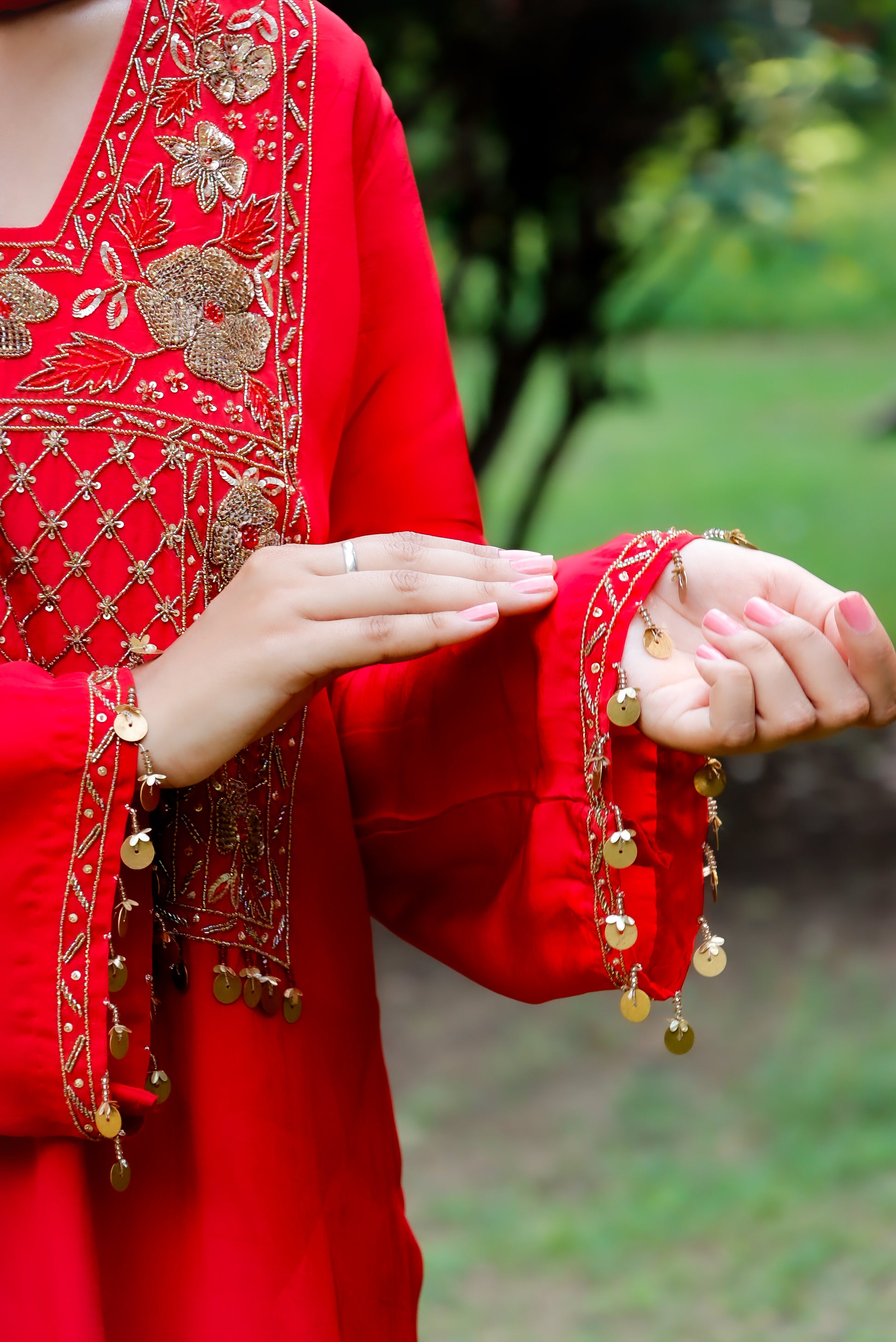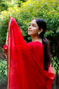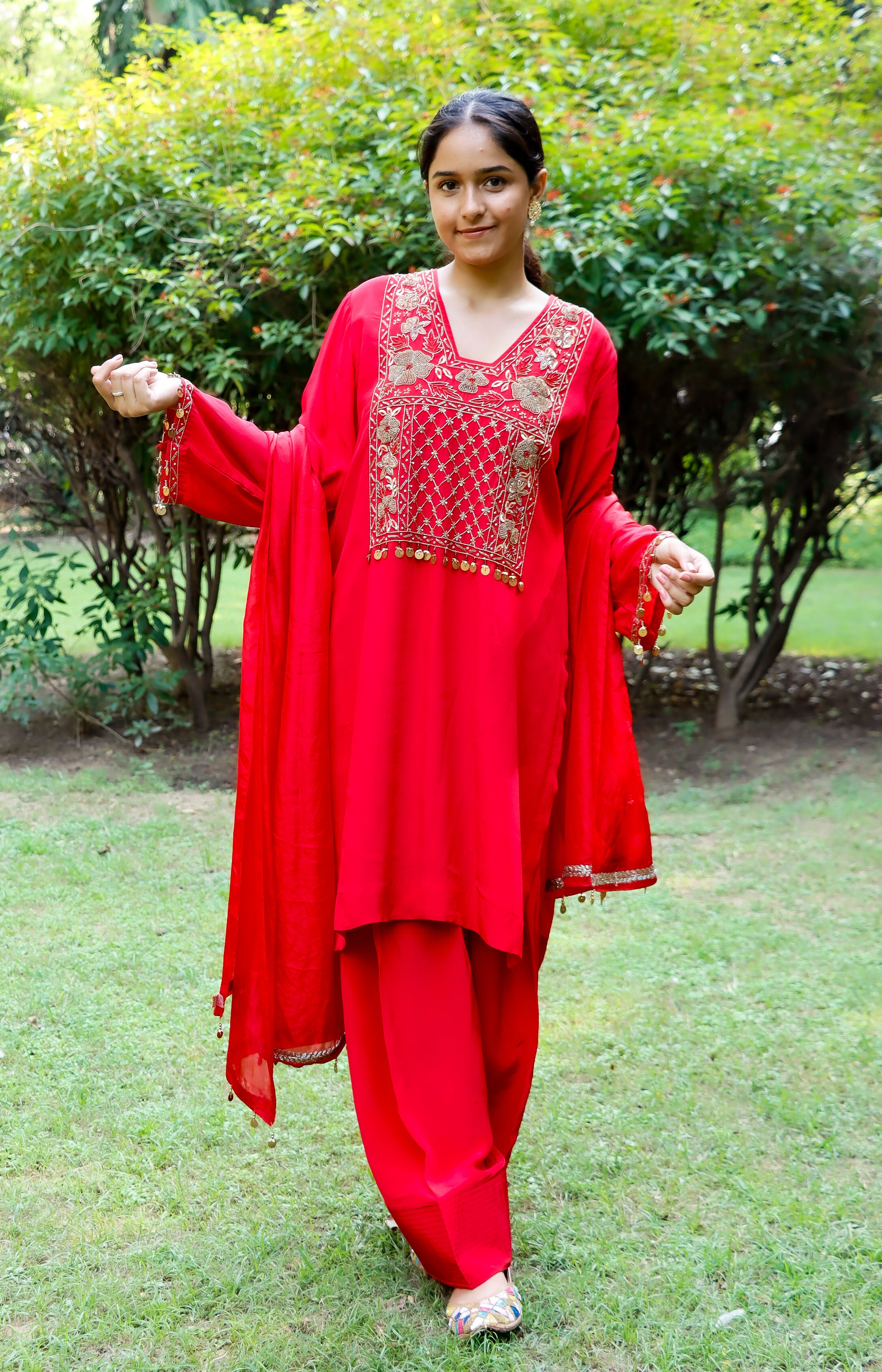Radiate timeless elegance in this Red Crepe Silk Suit, crafted to perfection for festive occasions. The kurta features delicate work on the neckline, adding a refined touch of artistry. Playful tassels on the sleeves and dupatta lend a charming festive flair. The set is paired with a luxurious Tabby Silk dupatta, known for its soft texture and subtle sheen, enhancing the overall richness of the ensemble. Completing the look is a Farsi-style salwar, offering comfort with a traditional twist.