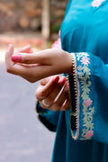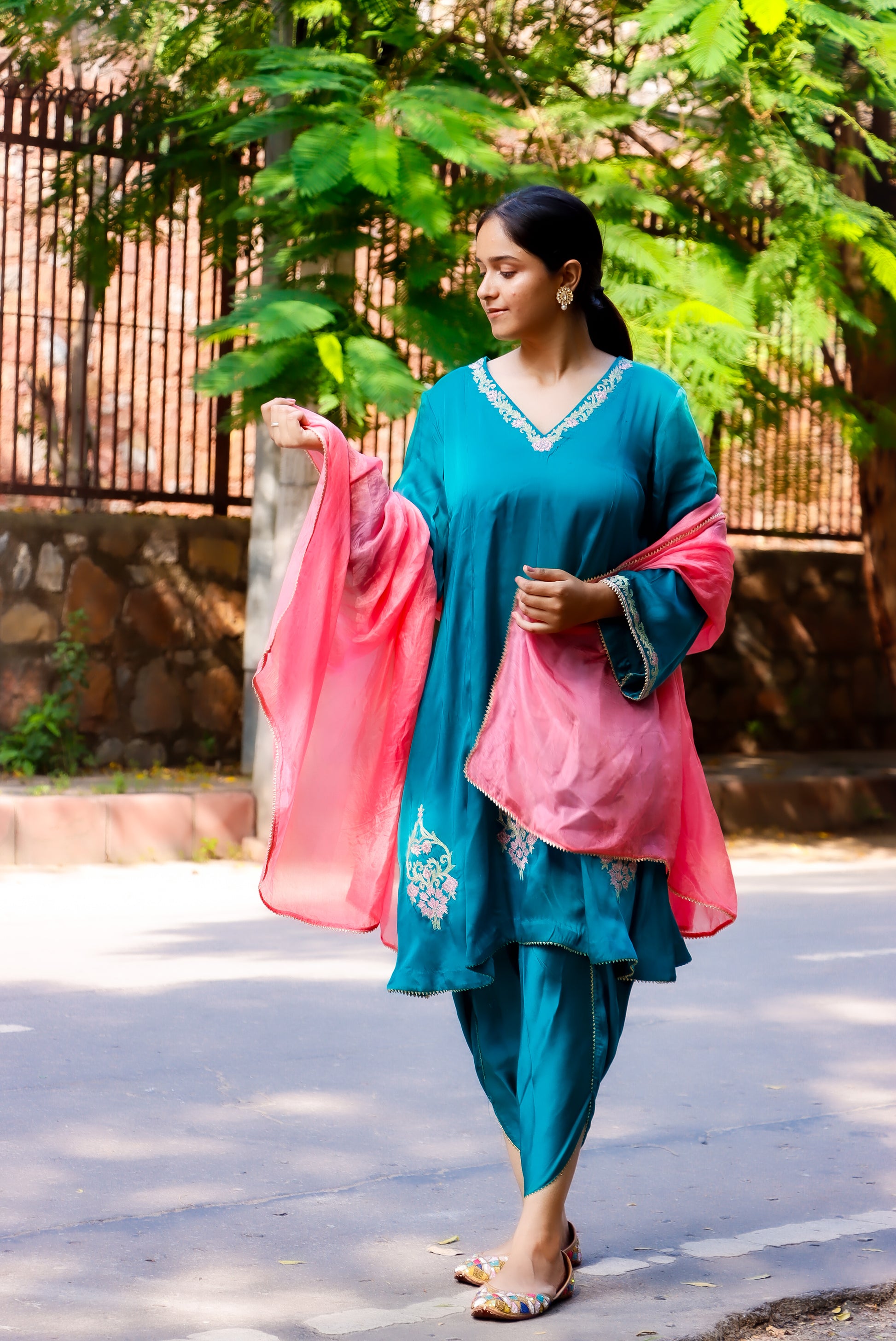 Chic and contemporary—teal modal satin suit with resham zaridori detailing, six-panel kurta and tulip pants. Styled with a contrasting pink tabby silk dupatta, this suit is bold, elegant, and ready to turn heads.