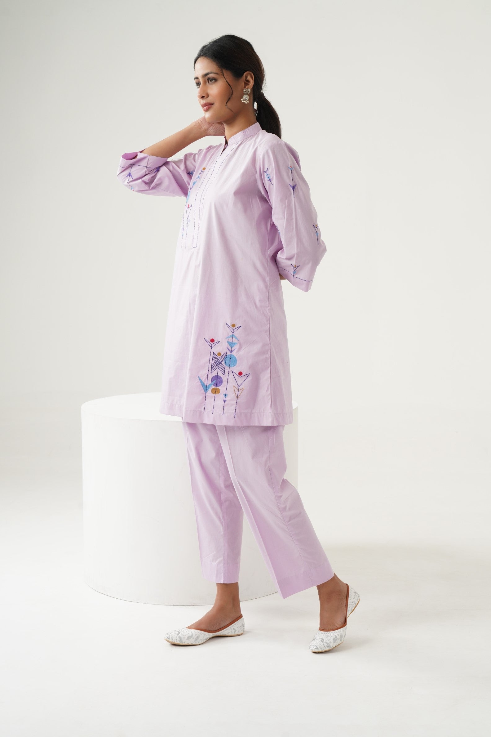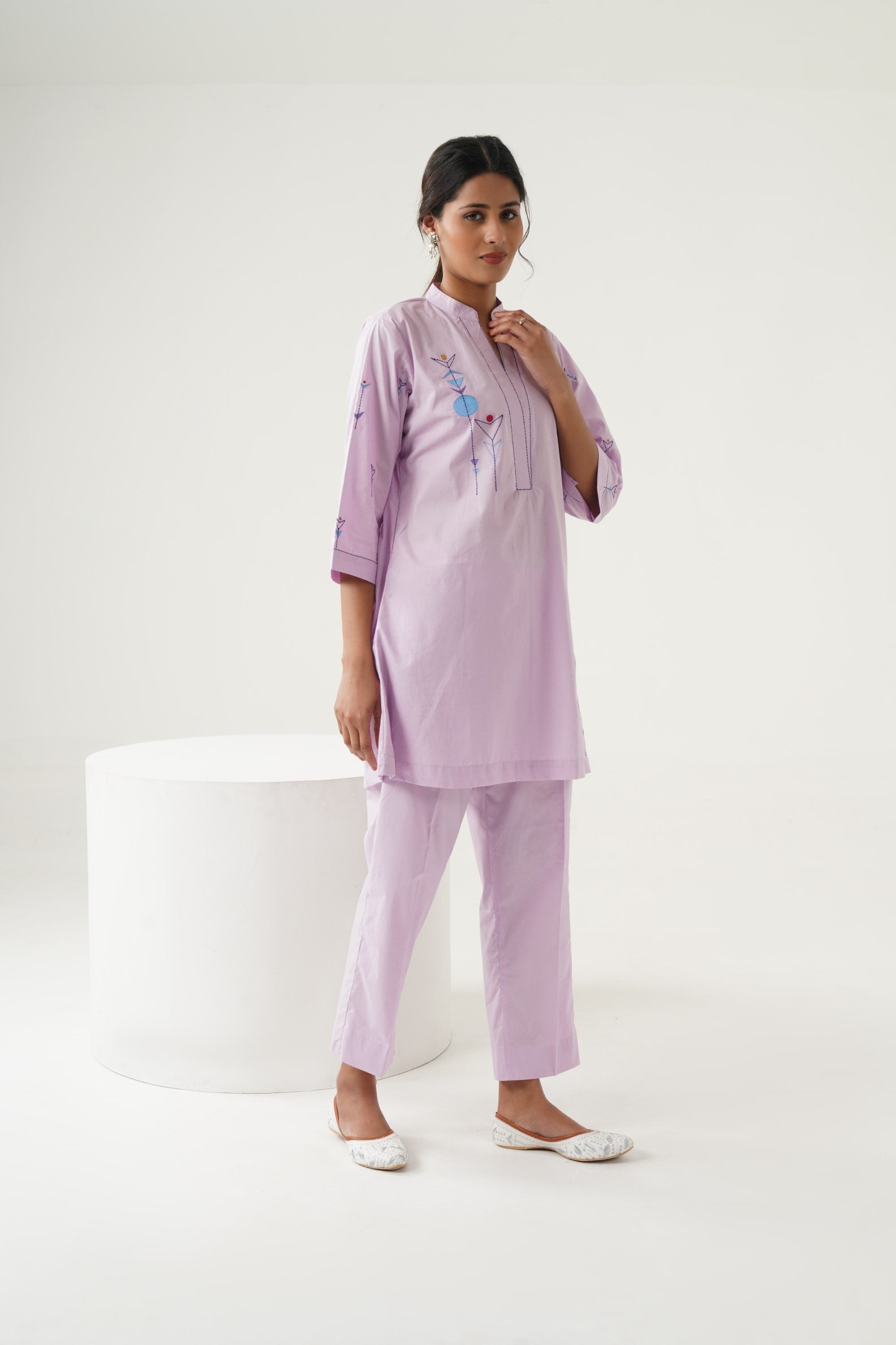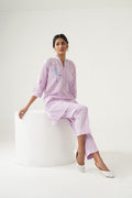 Upgrade your wardrobe with this stylish and comfortable mauve co-ord set. Crafted from breathable pure cotton, the ensemble features intricate embroidery on the shirt and sleeves, adding an elegant touch to its relaxed fit design. Perfect for casual outings or creative workdays, this set combines fashion and functionality effortlessly.