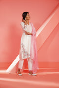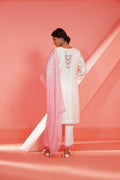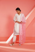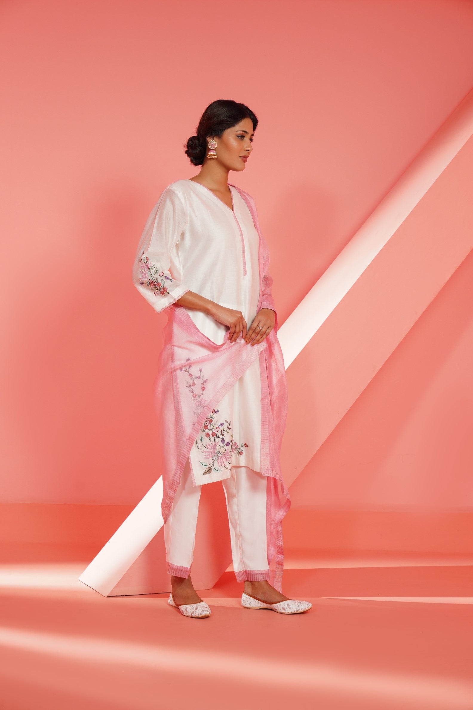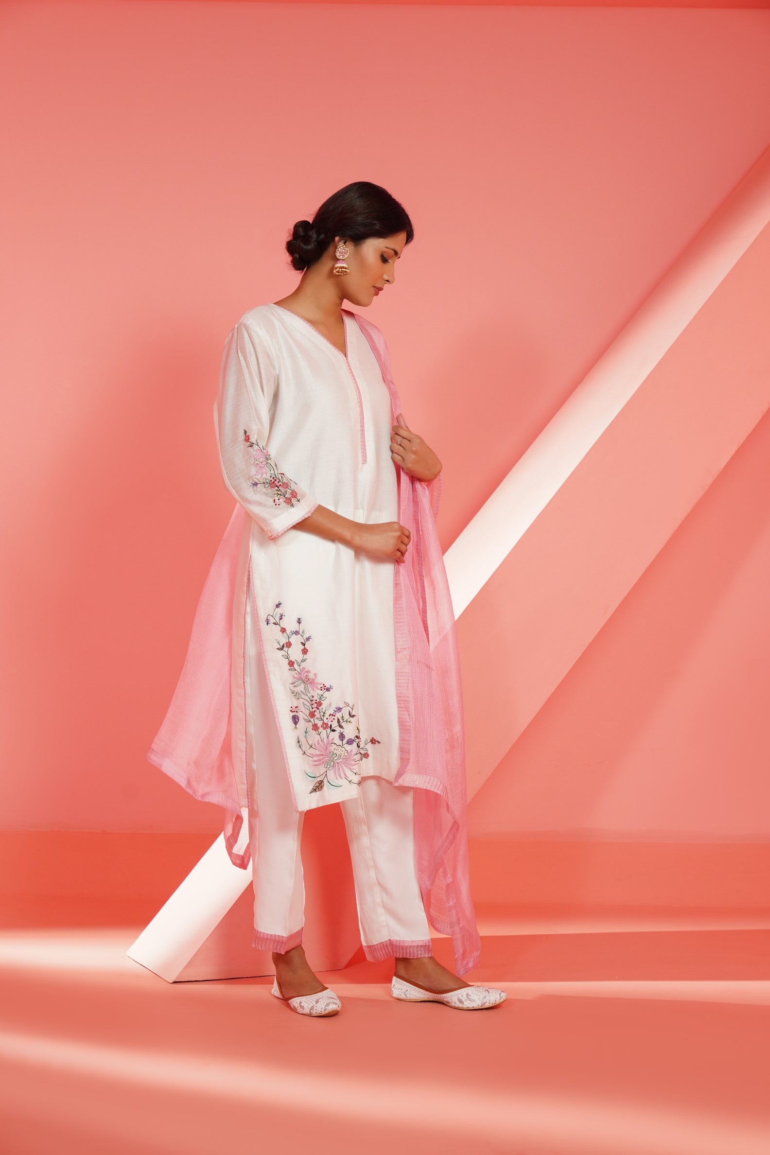 This exquisite Chanderi silk suit embodies elegance and refined craftsmanship. The kurta features intricate Jacobean flower embroidery on the daman, sleeves, and back, adding a regal touch to the ensemble.The suit is paired with a luxurious silk Doria dupatta, adorned with a Chanderi silk stripe border that enhances its sophistication and grace.