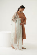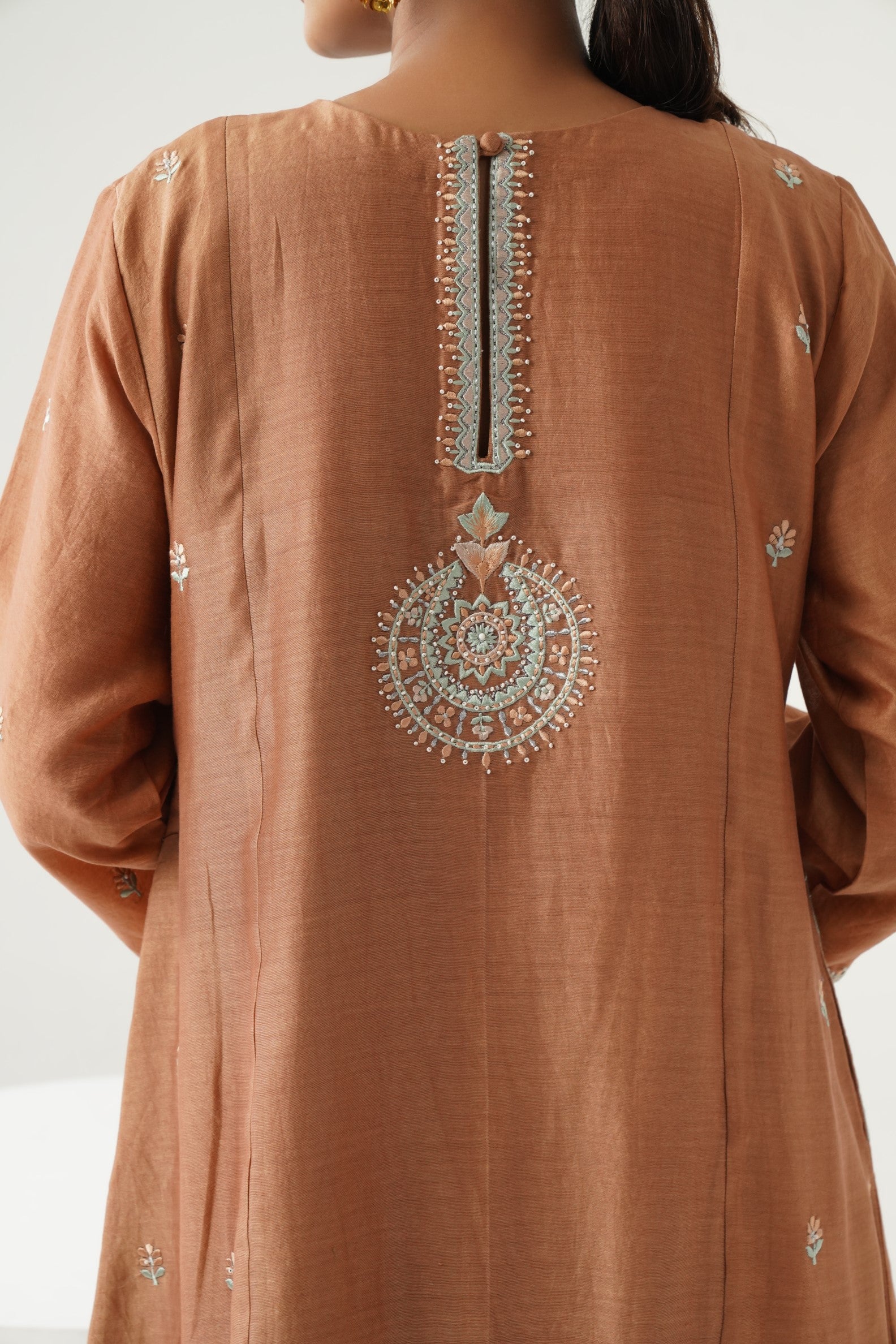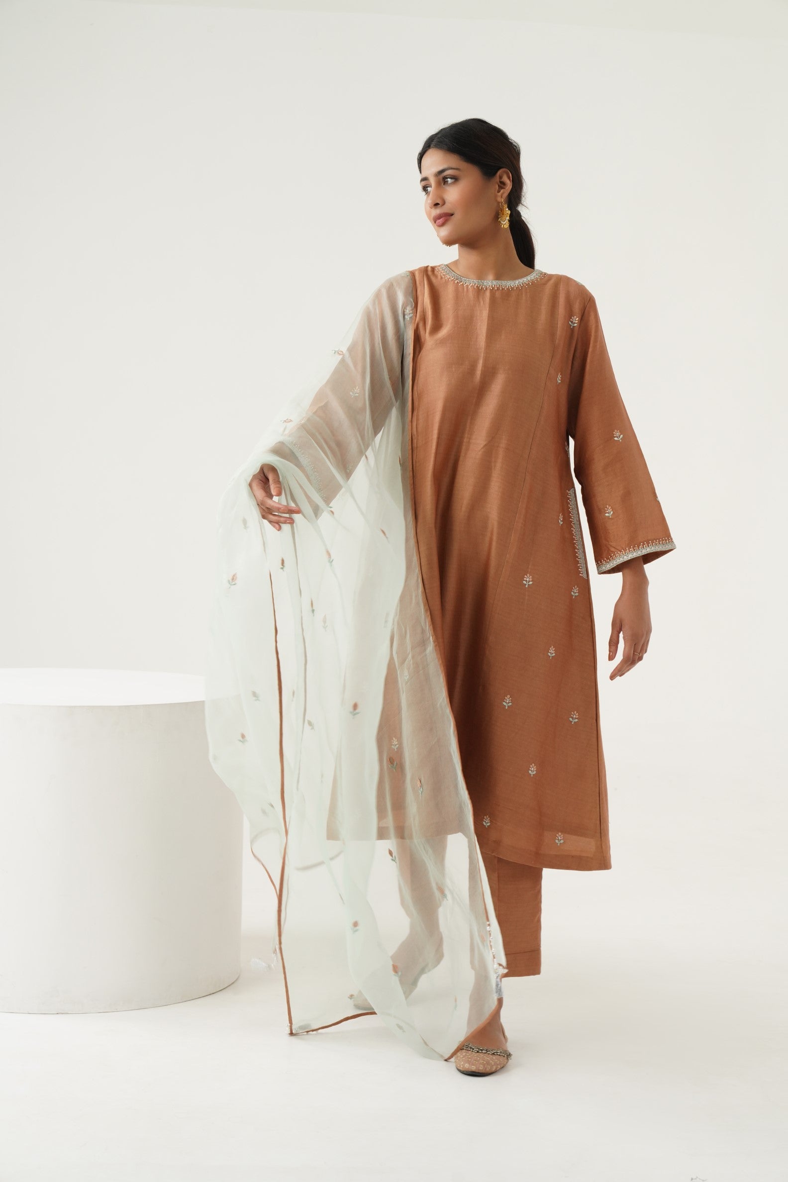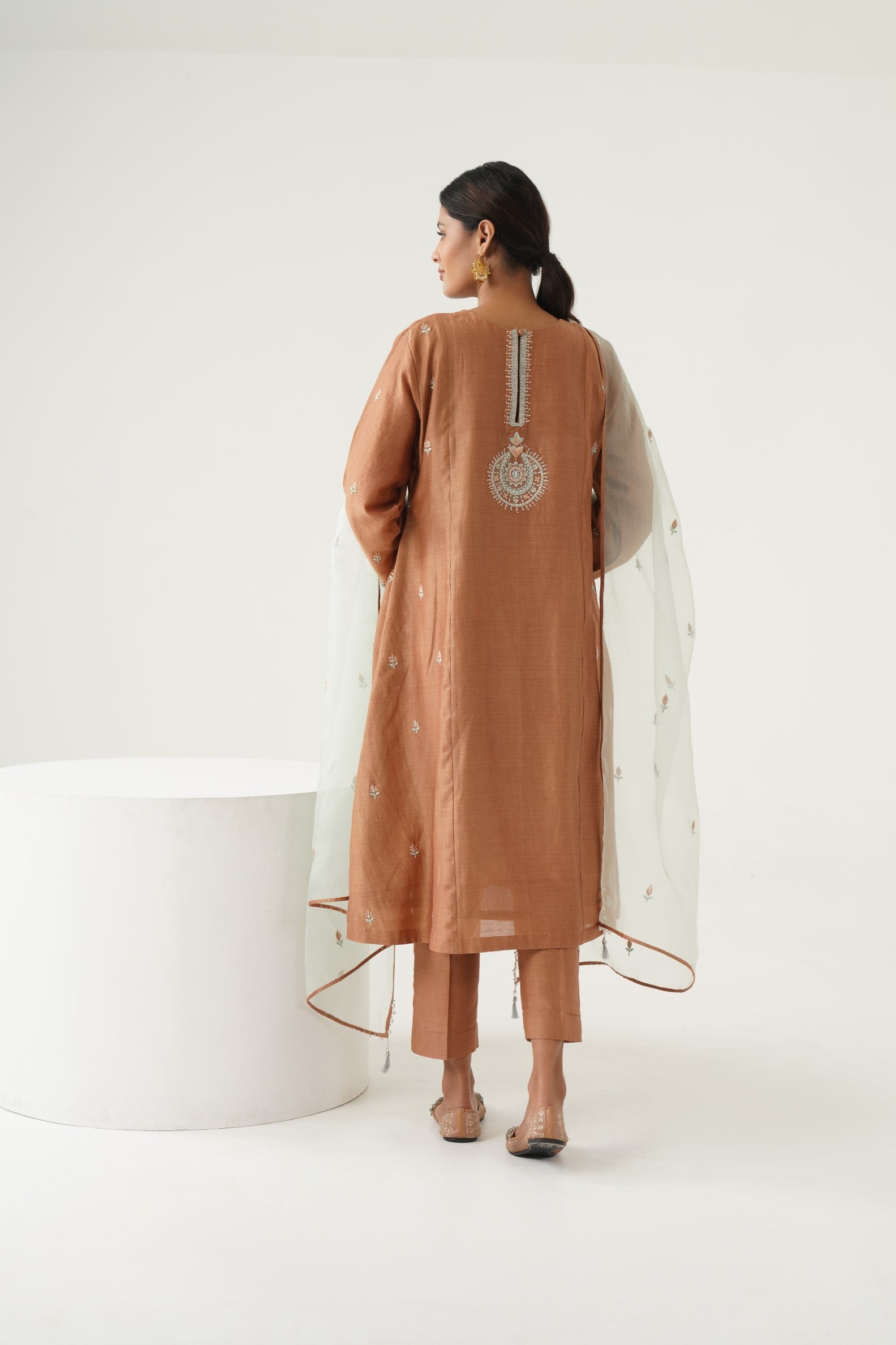 Embrace timeless elegance with this exquisite Chanderi silk suit, featuring delicate embroidery on the neck and a striking Mandala motif on the back. The suit comes with a contrasting silk organza dupatta, adorned with delicate flowers that seem ready to bloom, adding a touch of nature-inspired beauty. This ensemble is perfect for festive occasions, weddings, or any event where you want to stand out with grace and sophistication.