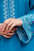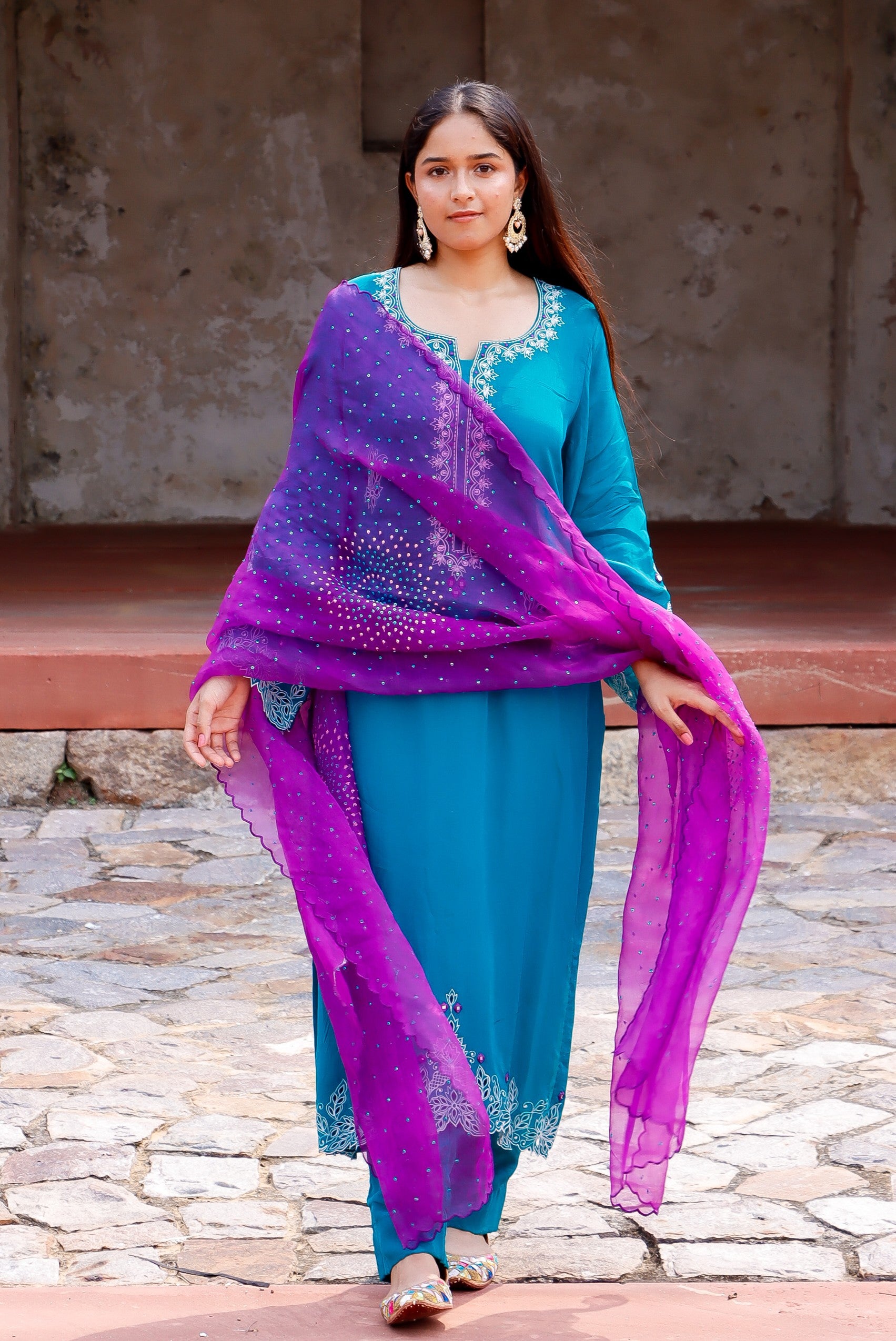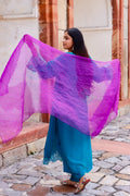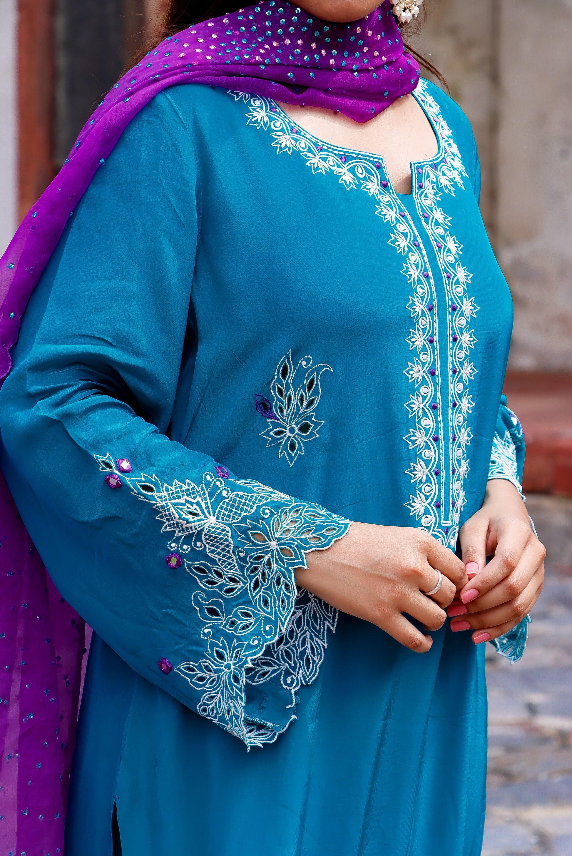 Indulge in elegance with this peacock-hued silk crepe suit, detailed with mirror & cutwork embroidery. The pure organza silk dupatta, hand-finished with scalloped edges, is artistry in motion.