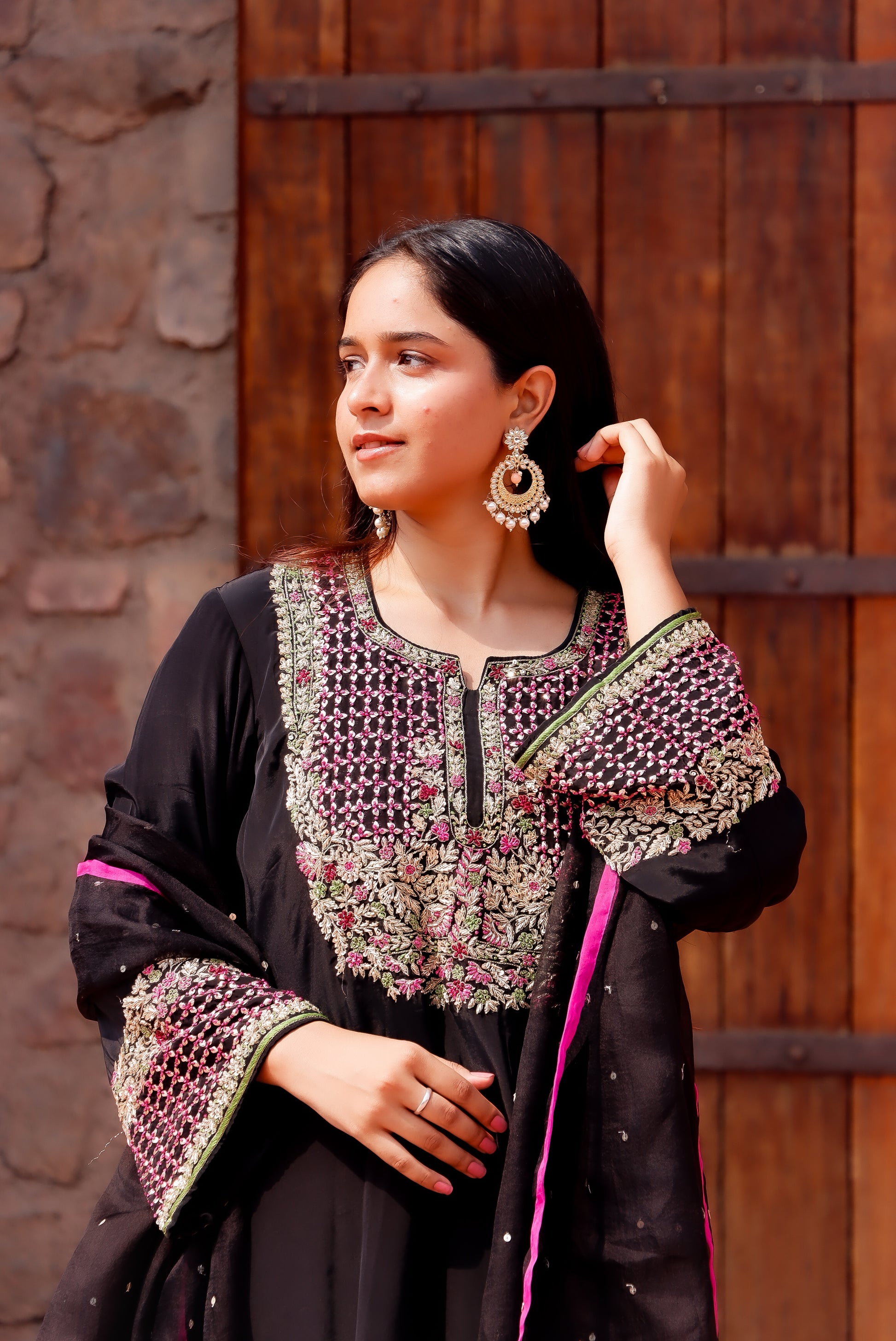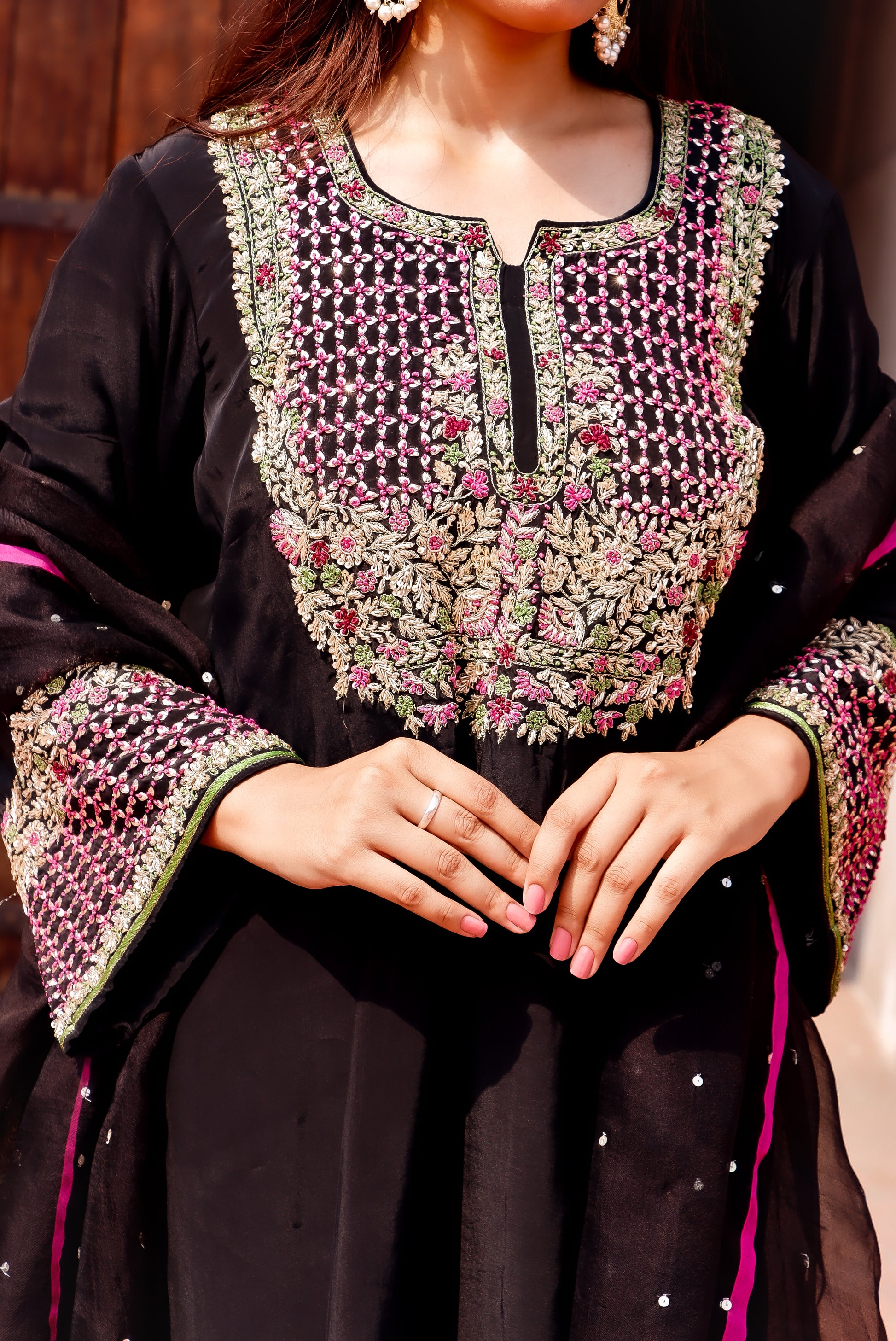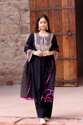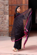 A masterpiece in black—this crepe silk Farshi salwar kurta is elevated with exquisite hand-done zardosi and resham knot work. Paired with a sheer organza silk dupatta, finished with striking fuchsia pink edges, it’s elegance with a bold twist.